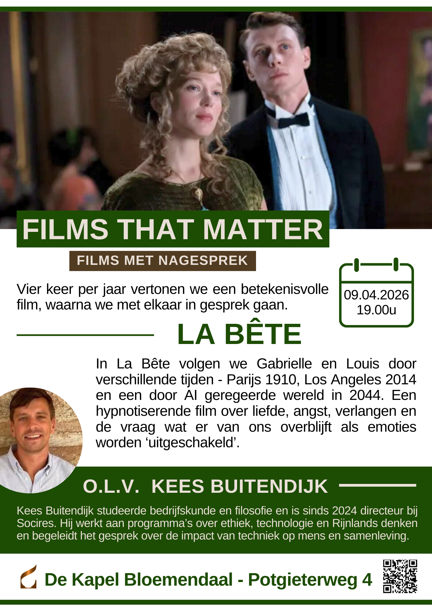 Met Films that Matter opent De Kapel Bloemendaal een nieuw venster op de wereld. In deze reeks filmavonden wordt betekenisvolle cinema verbonden met filosofie, gesprek en ontmoeting. Vier keer per jaar nodigen we bezoekers uit om een film niet alleen te bekijken, maar ook te bevragen: wat zien we eigenlijk? Wat raakt ons? En wat zegt dit over de tijd waarin wij leven?